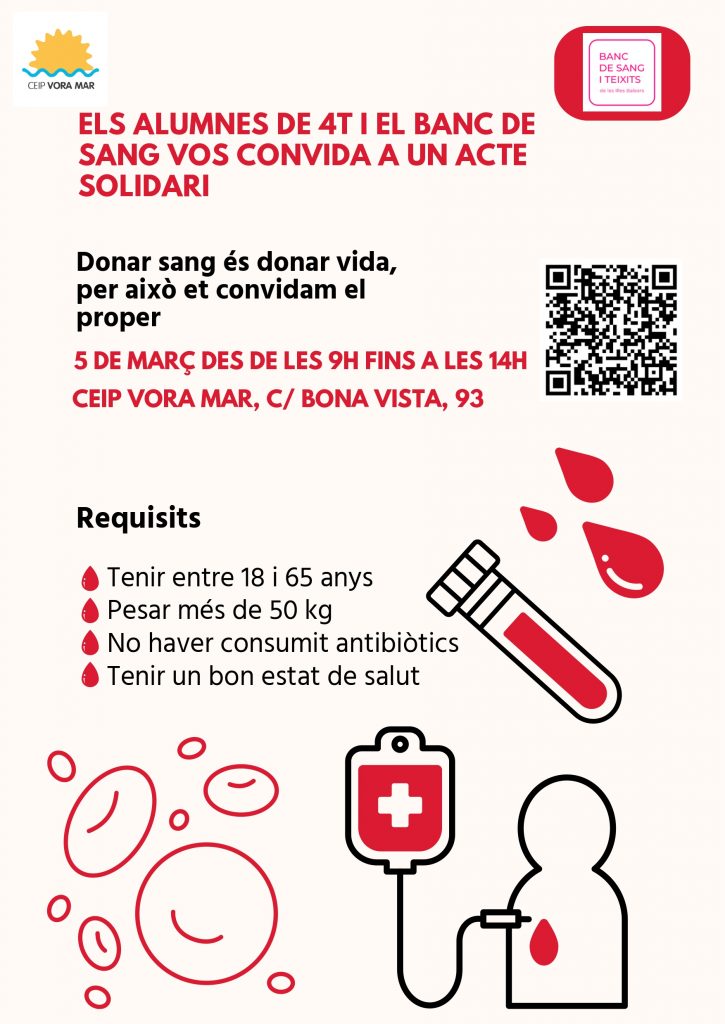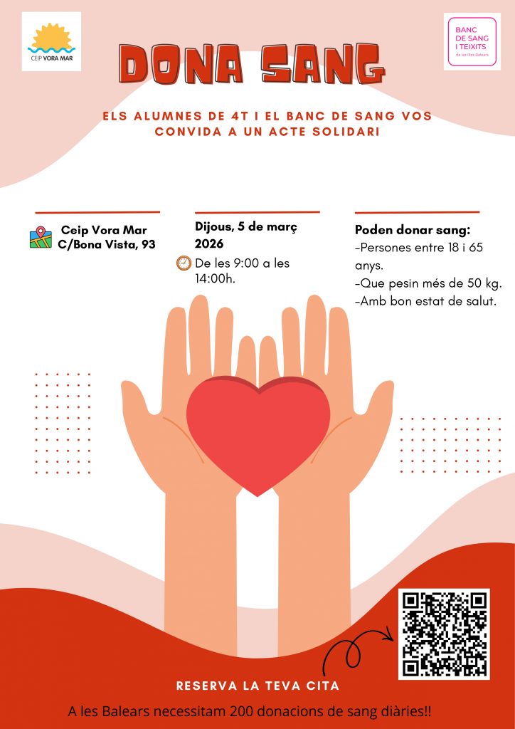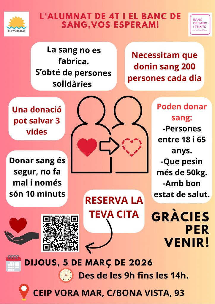 L’alumnat de 4t de Primària del CEIP Vora Mar, després de treballar en un projecte sobre la sang, ha organitzat, juntament amb el Banc de Sang i Teixits de les Illes Balears, una campanya de donació de sang.